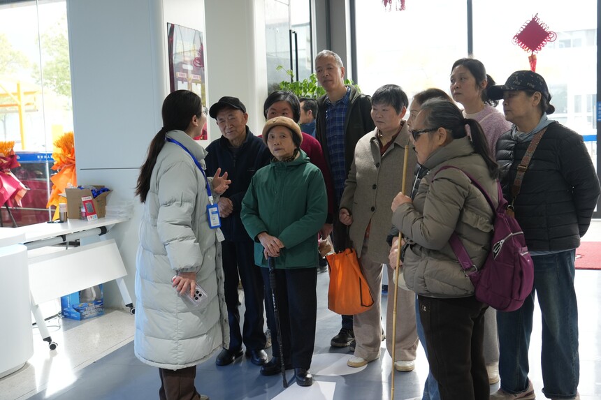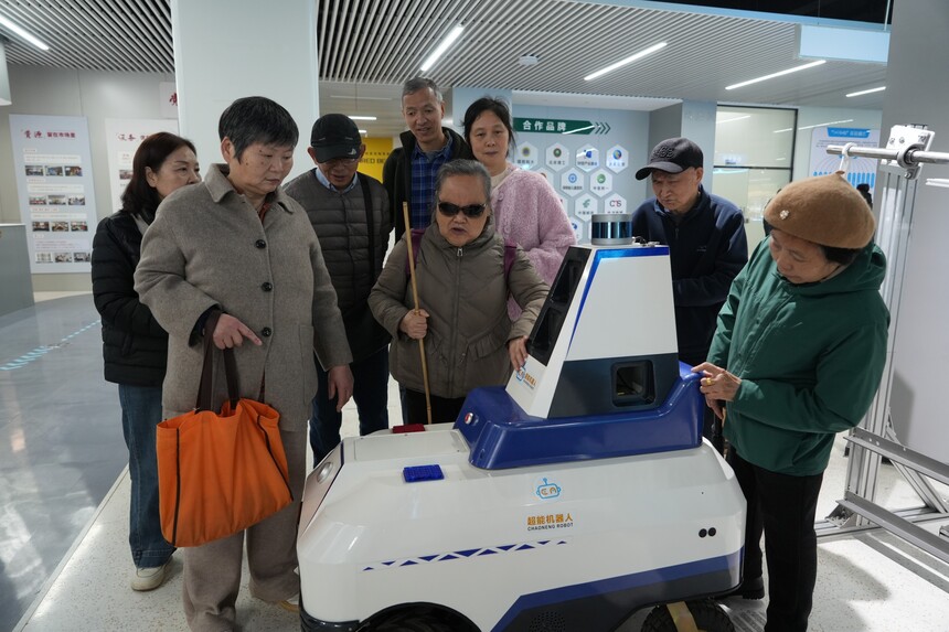在工作人员的耐心讲解与全程协助下,盲协成员们深入参观了机器人超市、居家养老、疗愈养生、安保巡逻等多个应用场景。虽然无法亲眼目睹机器人的炫酷外形,但视障朋友们用双手仔细触摸了每一款产品,通过指尖的触感去构建对科技产品的认知,感受机器人的轮廓与质感。