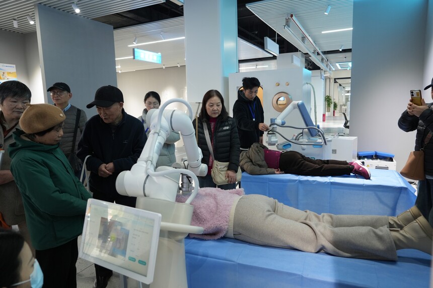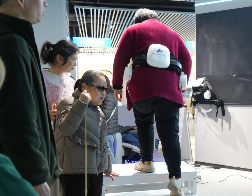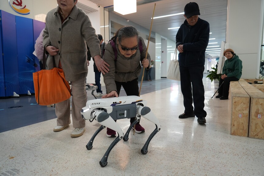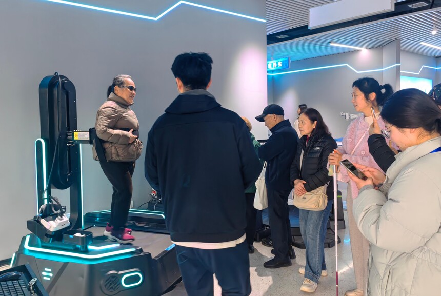 在智慧康养区,视障朋友体验了中医健康机器人的体检流程与健康咨询服务,感受传统中医与AI技术的神奇结合;在疗愈养生区,机器人精准的按摩手法让大家连连称赞。此外,视障朋友还近距离接触了机器狗、外骨骼机器人及巡逻机器人。